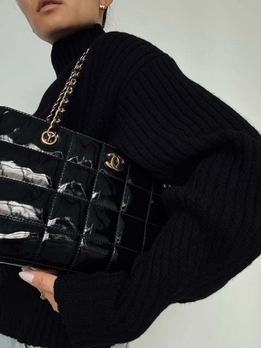 Vintage Chanel Chocolate Bar Quilted Black Patent Leather Shoulder Bag (2002-2003)
