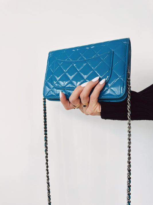 Chanel Quilted Blue Patent Leather Wallet on Chain WOC (2014)